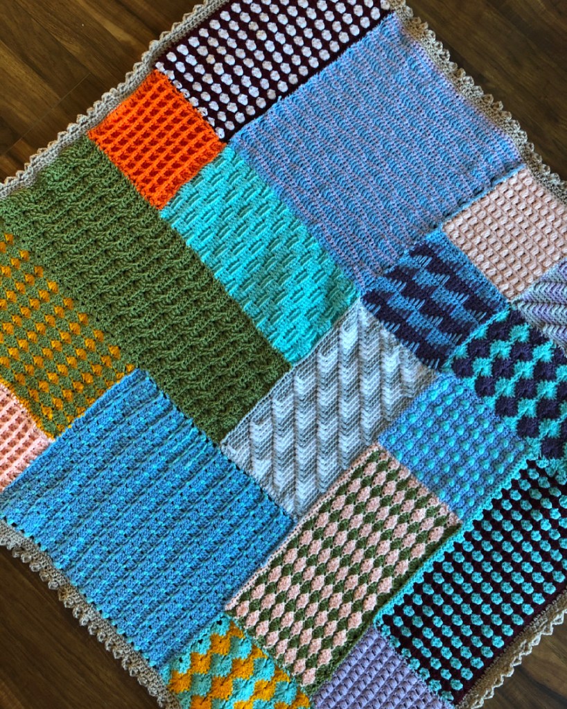 Onto the final countdown…the final three stitches. The wave stitch was another nice one to hook whilst watching your favourite show. You almost just had to just go through the motions – double crochet to half treble to treble to double treble and just follow the previous row for guidance to create the waves. The basketweave stitch was another like the cable stitch, it came together at the end and created a simple but effective textured stitch.